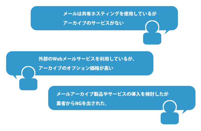 最近は上記のようなお声をよく耳にします。アーカイブ製品、サービスの普及に伴って、導入を検討される企業側の利用されているメール環境が以前と比べ多様化したことと、外部のメールサービスを利用されるケースが増大したことで、アーカイブの製品やサービスが非対応の場合があったり、ベンダー側の採算が合わずに断られるケースが増えてきているようです。